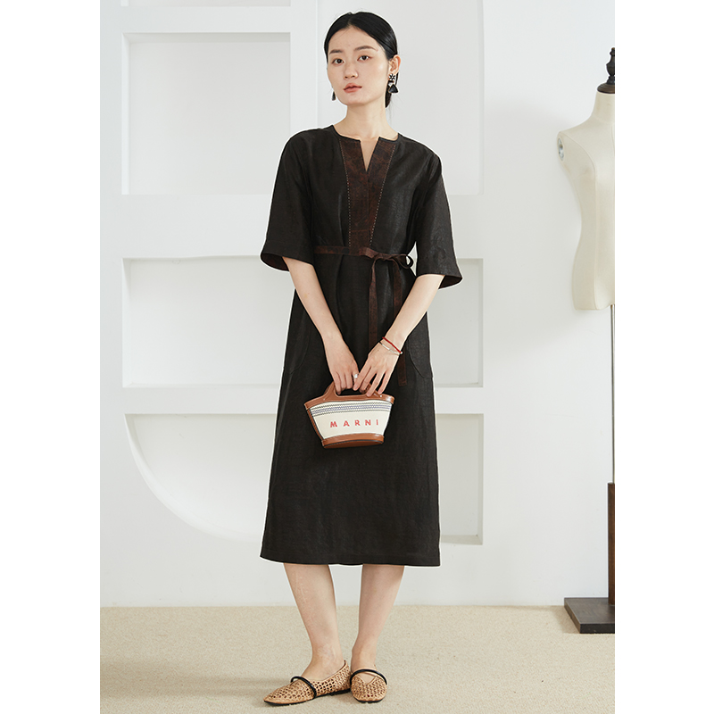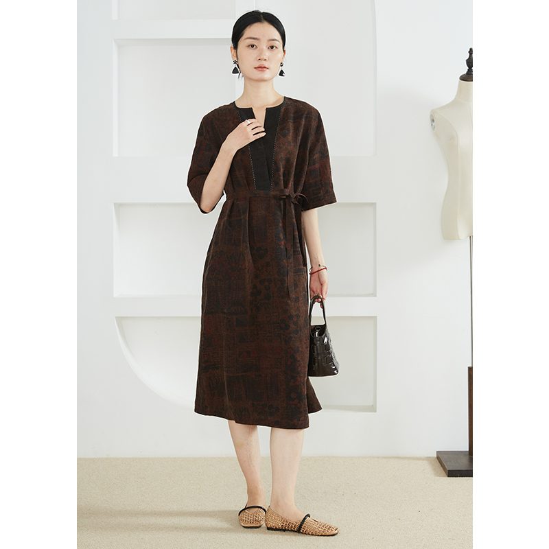 连衣裙女25年夏季 复古V领雪纺长袖 收腰显瘦气质长裙 微胖法式 XZY