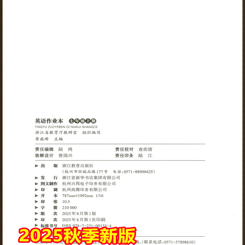 社同步课时特训7年级上课堂同步练习含答案 浙江教育出版 2025秋义务教育教材英语作业本七年级上册A B共2册配套人教版
