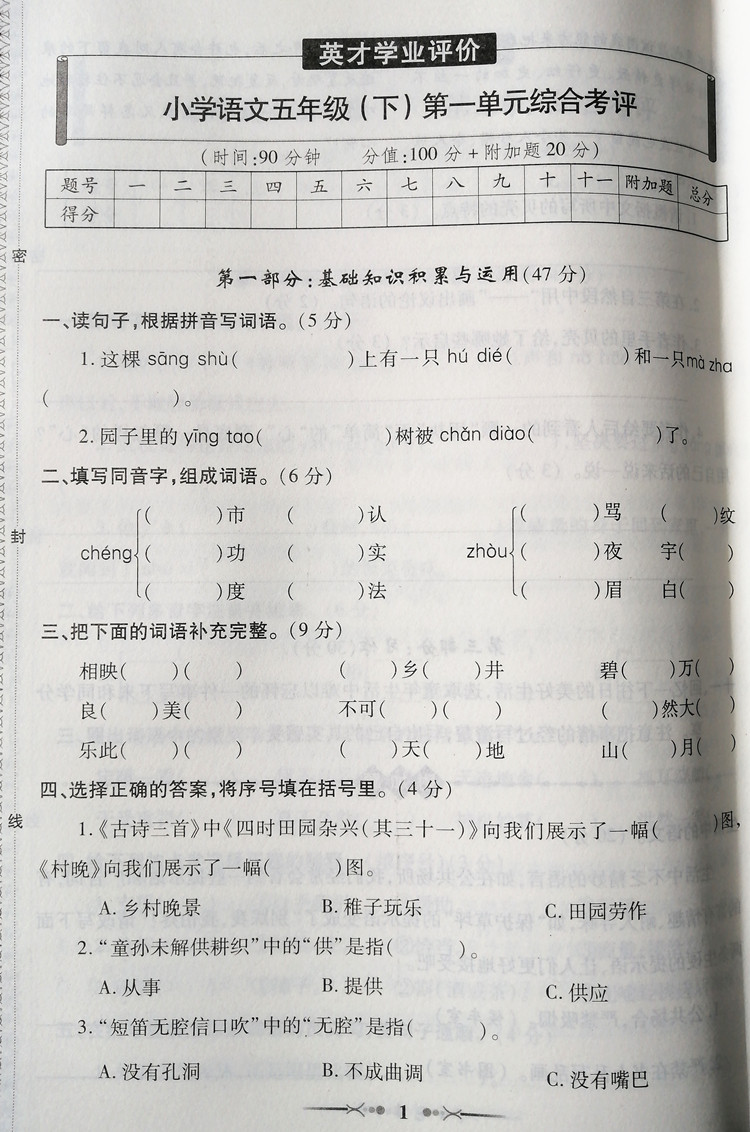 阅读专项训练 英才学业评价 教材 春季 综合考评测试卷 人教版 5年级下册 五年级下册语文 语文 配人教版 英才考评升级版 同步练习