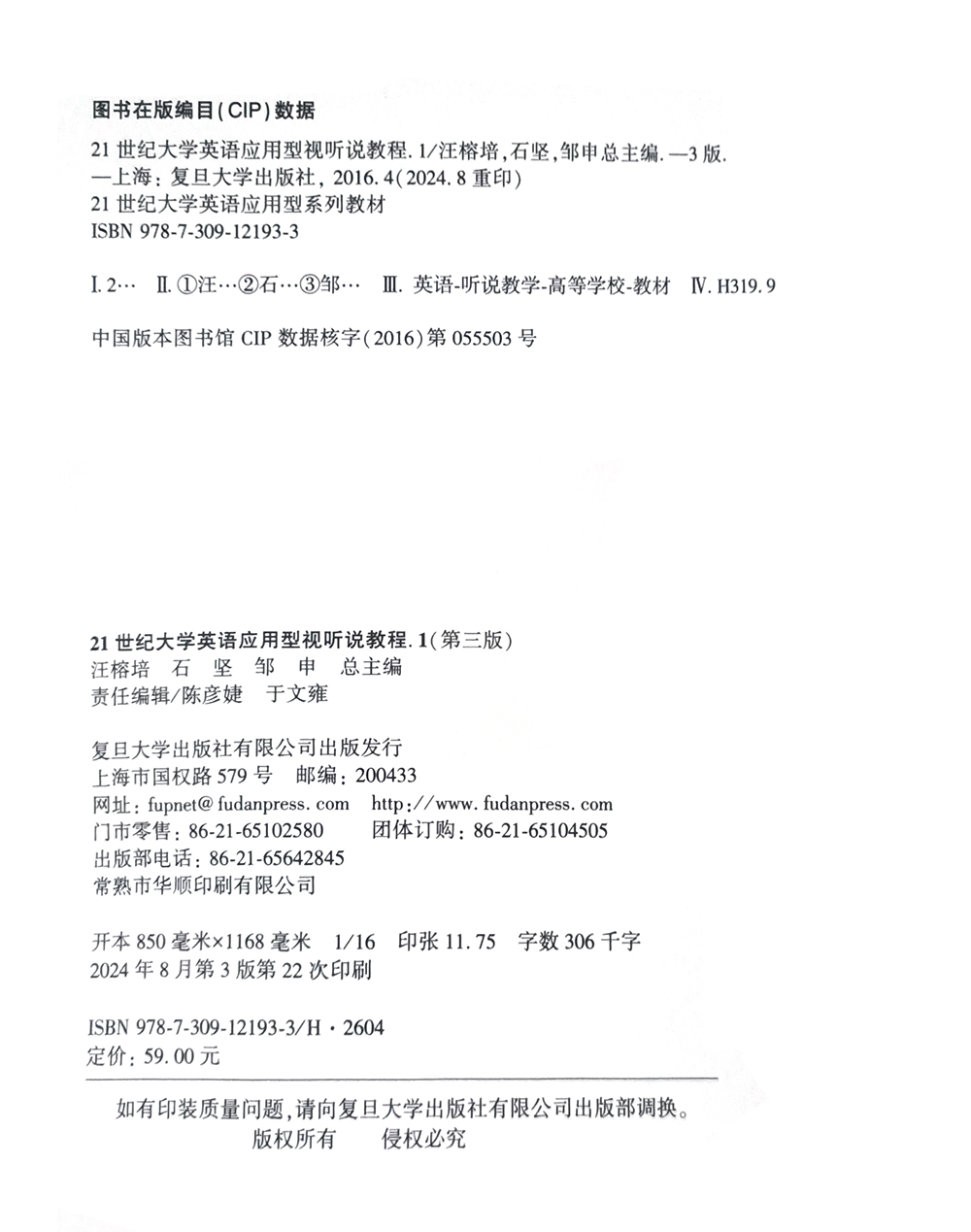 1复旦大学出版 应用型视听说教程第三版 社9787309121933 汪榕培 复旦21世纪大学英语应用型视听说教程1第3版