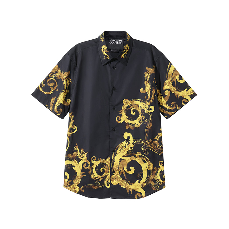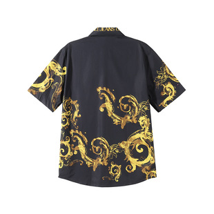 痞帅高级感休闲男装 美式 男夏季 衬衫 古巴领衬衣 黑色肌理感提花短袖