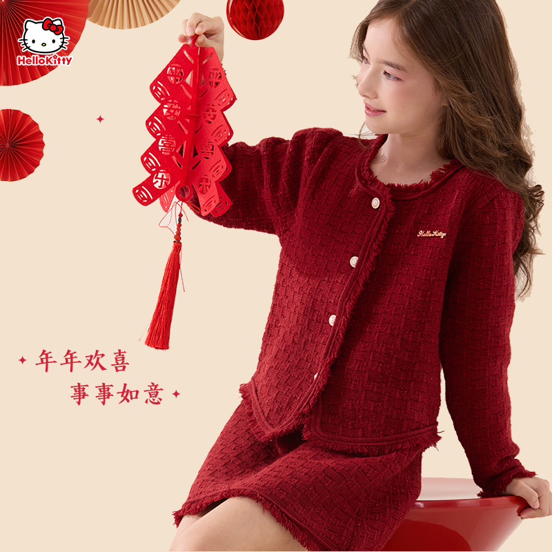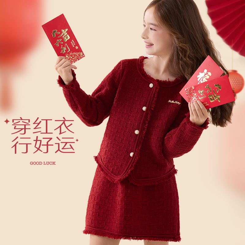女童套装 儿童秋冬新年裙子大童红色本命年加厚毛衣过年洋气拜年服