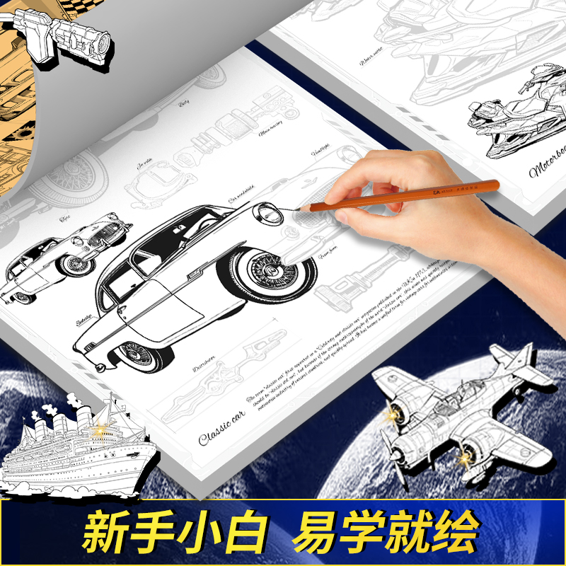 速写美术素描本画纸 漫画涂色动漫控笔练习卡通绘画本 零基础新手描画本 浅印线描临摹画册 机甲汽车飞机轮船儿童简笔画线稿描摹本