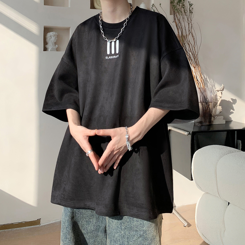潮牌青少年仿麂皮绒简约宽松圆领半袖 美式 新款 T恤男秋季 重磅短袖