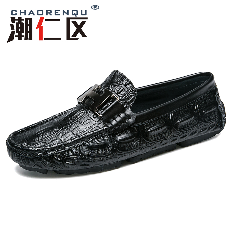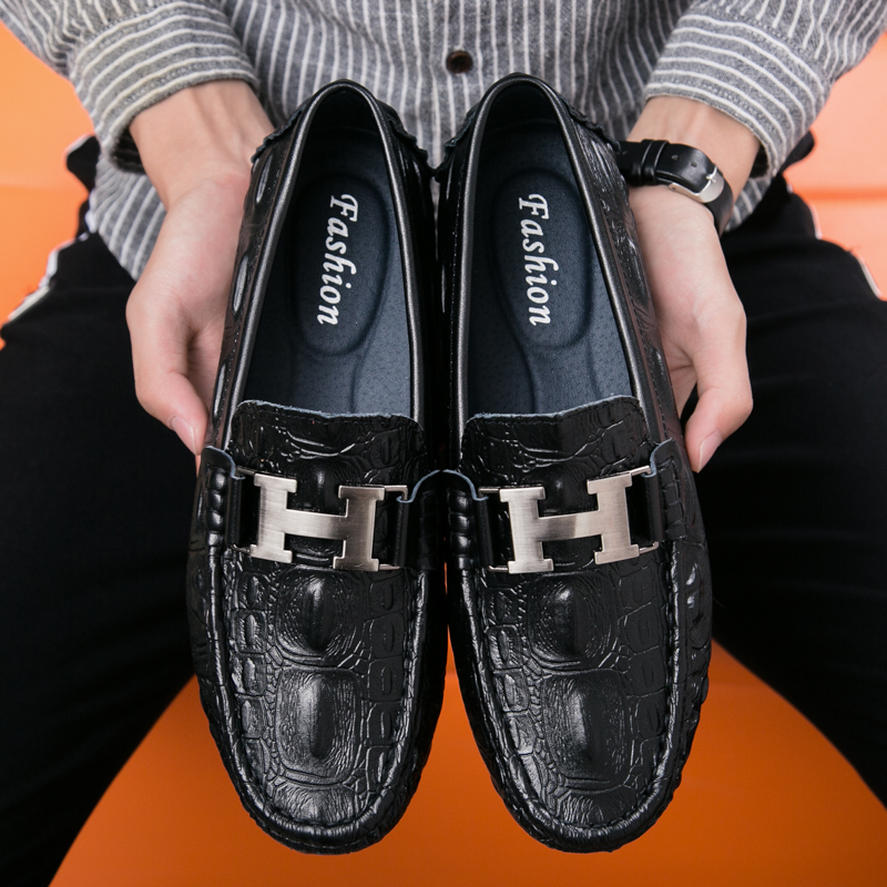 豆豆鞋 百搭潮鞋 男真皮鳄鱼纹休闲皮鞋 Z韩版 H扣亮皮懒人鞋 2025春季