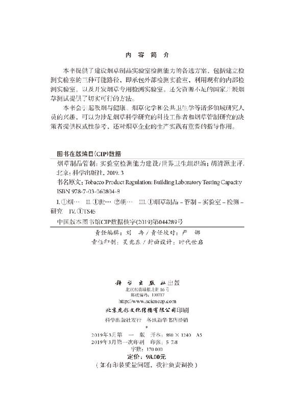 烟草制品管制:实验室检测能力建设 社 胡清源科学出版
