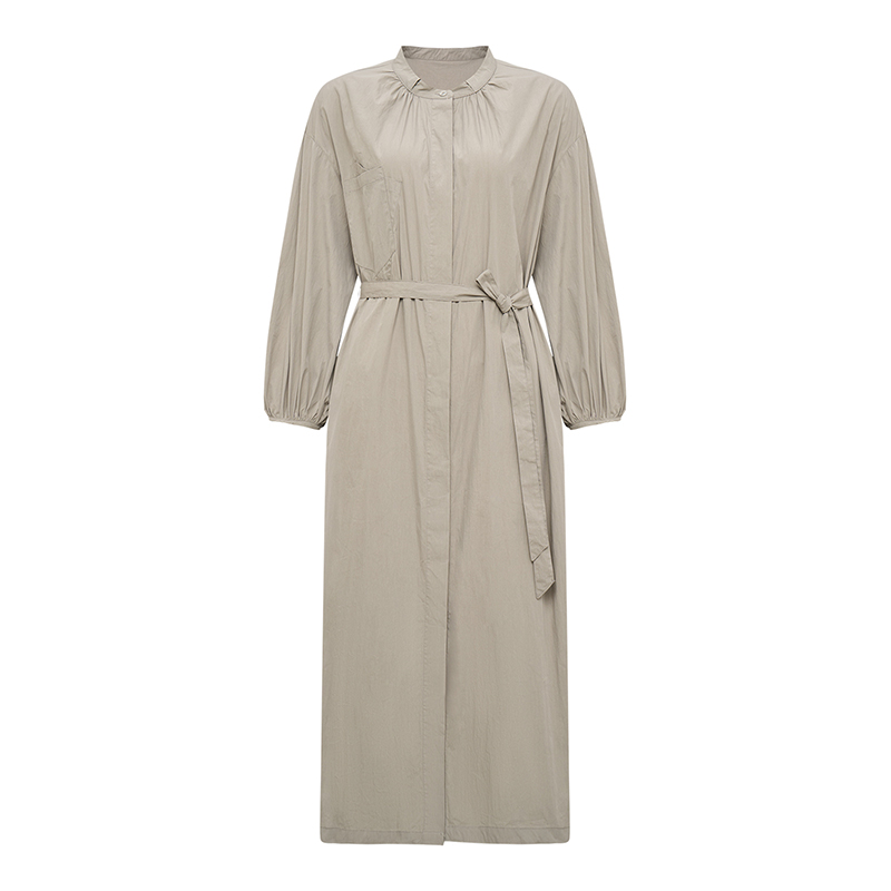 简约气质长裙 系带收腰 PetitBari浅卡其色立领连衣裙女新款 灯笼袖
