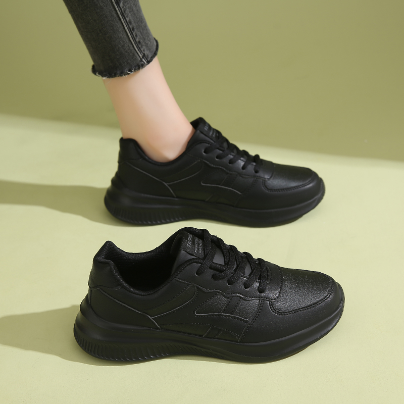 不累脚上班工作鞋 皮面防水防滑厨房鞋 女秋季 超轻软底全黑色运动鞋