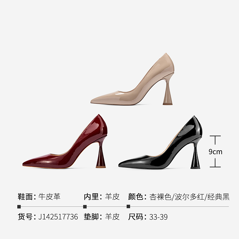 女 侧空红底裸色浅口气质单鞋 2025新款 细跟尖头漆皮名媛高跟鞋
