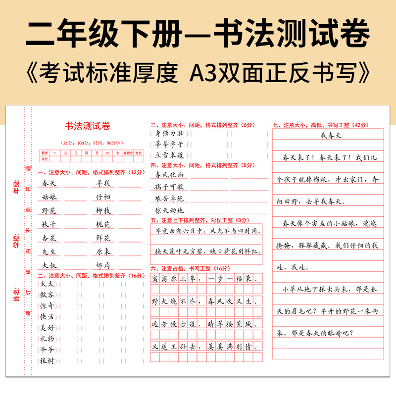 A3双面 一册2张二年级上下册120g双胶纸 考前练手模拟 定制排版 书法测试卷答题纸 2025版 印刷答题卡 小学书法测试答题卡