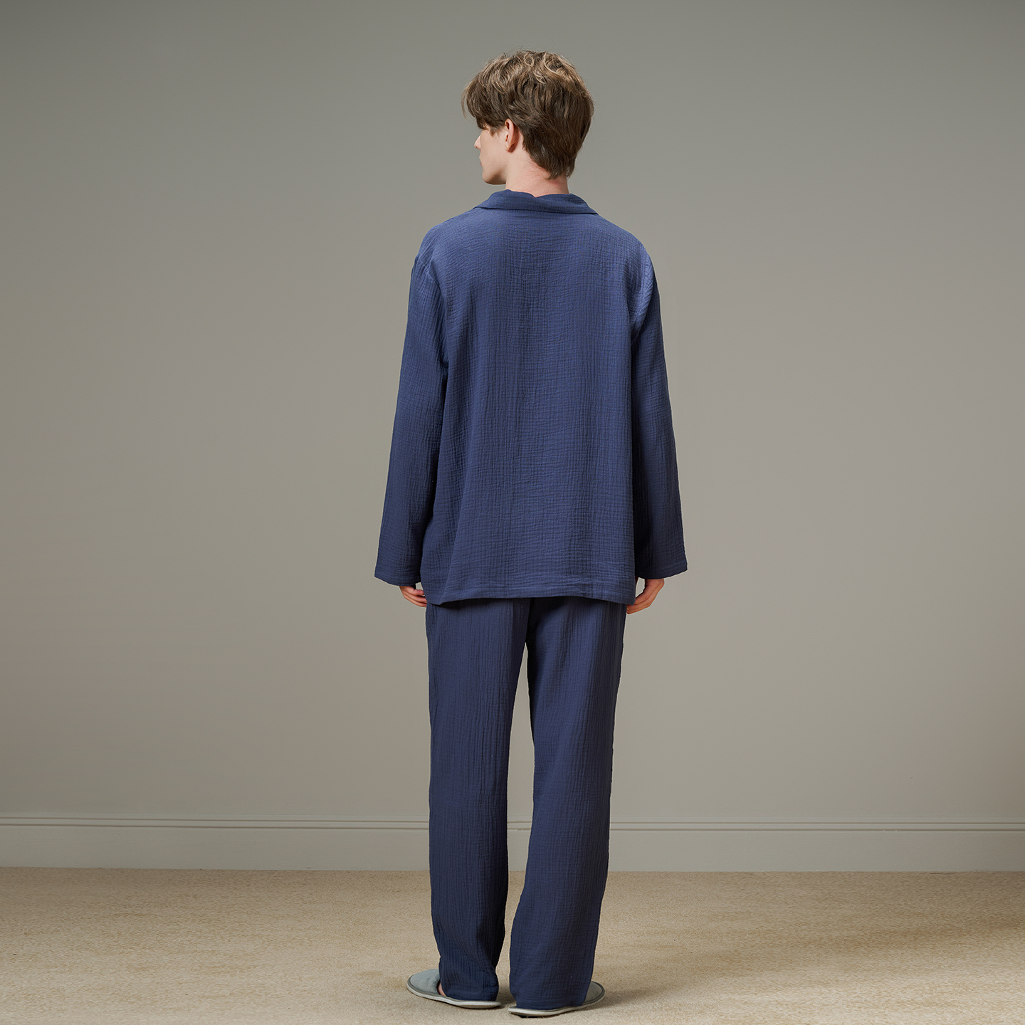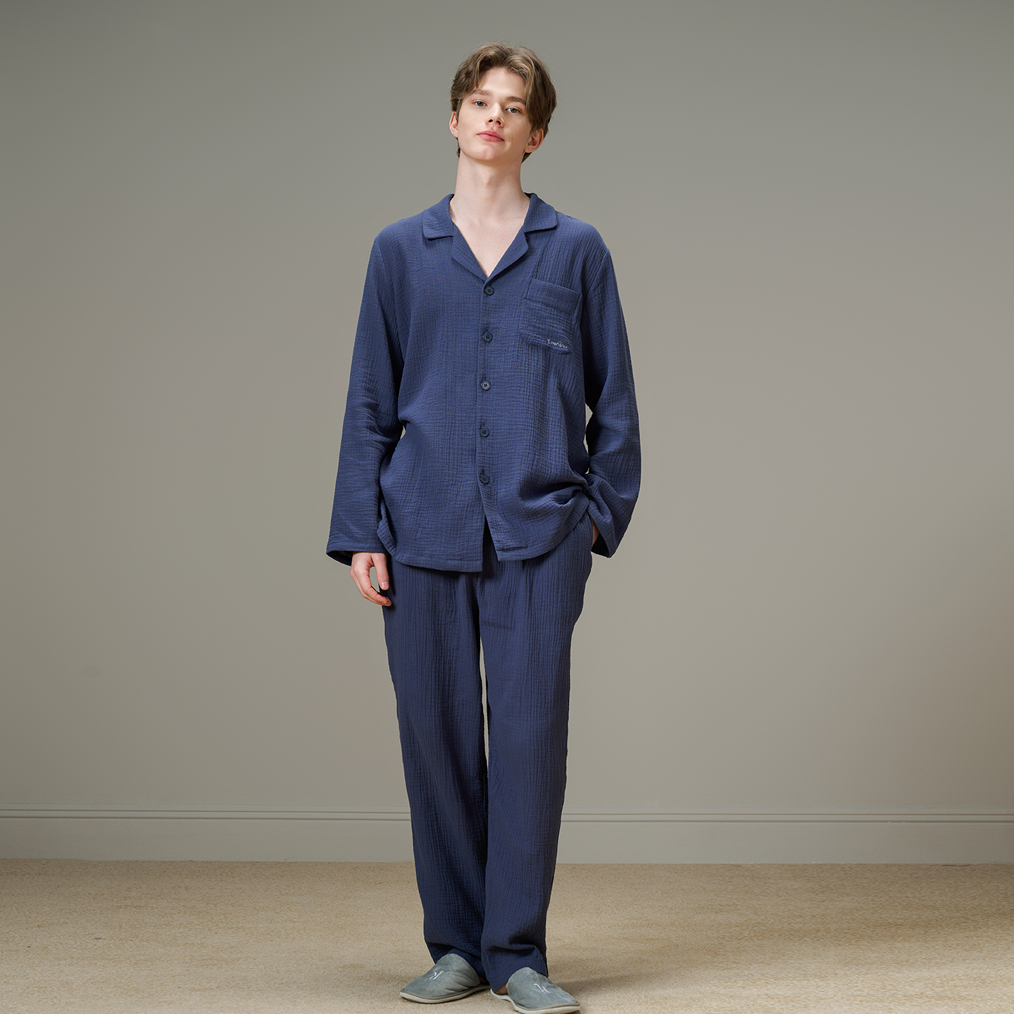 美标新款 男春秋双层棉纱全棉质休闲简约可外穿家居服 纯棉睡衣套装
