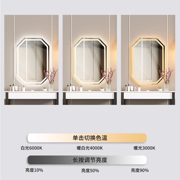 梳妆台镜子化妆镜带灯梳妆镜壁挂免打孔卧室上墙智能发光菱形镜子