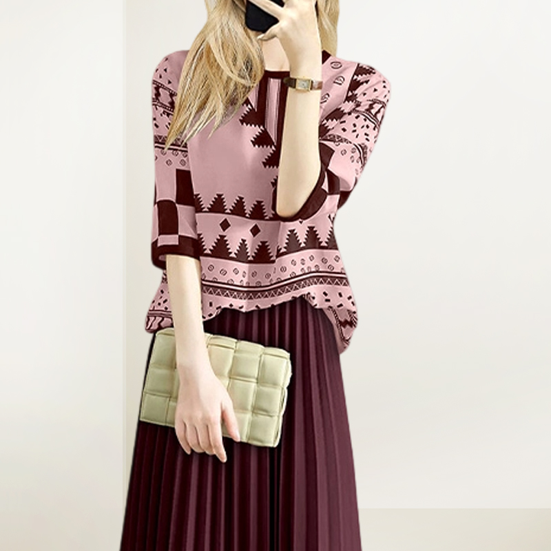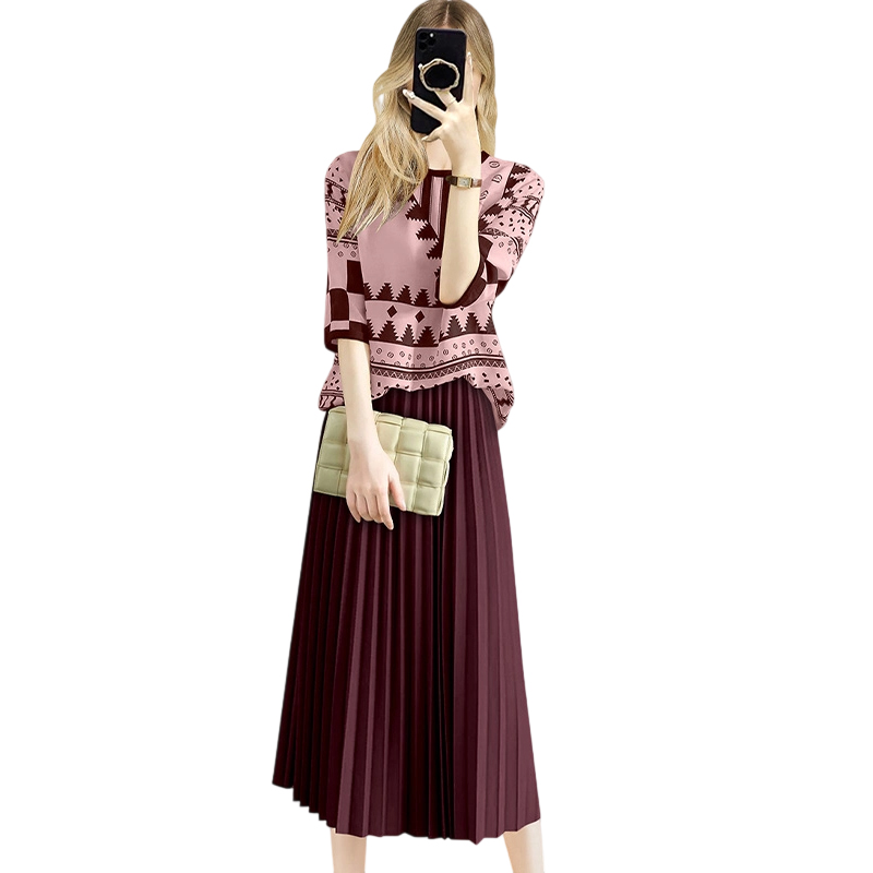 新款 女2025年秋装 复古印花上衣半身裙减龄两件套 气质减龄套装 法式