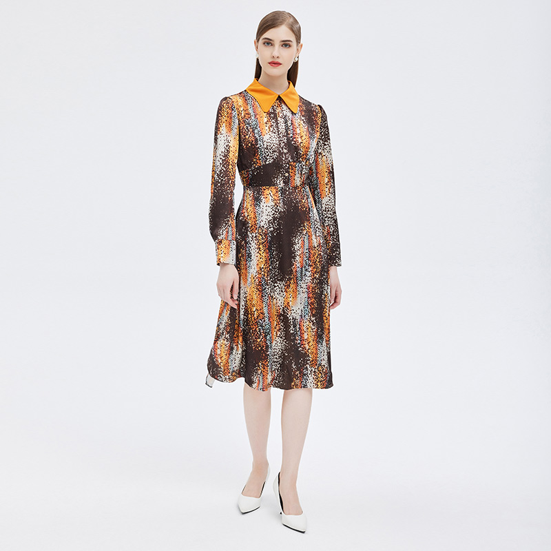 时尚 咖色娃娃领高腰印花连衣裙子长袖 百搭 马天奴秋冬新款 专柜正品