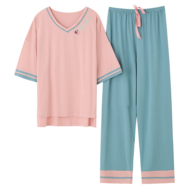 长裤 短袖 薄款 大码 猫人睡衣女夏季 家居服套装 纯棉带胸垫2025新款