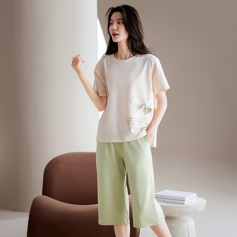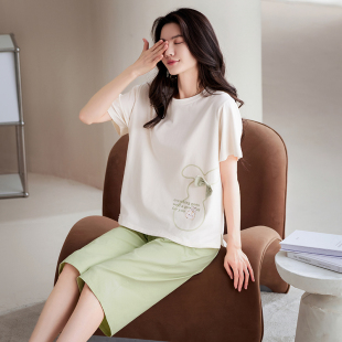 纯棉薄款 休闲家居服套装 短袖 可外穿大码 夏天 七分裤 芬腾女睡衣夏季