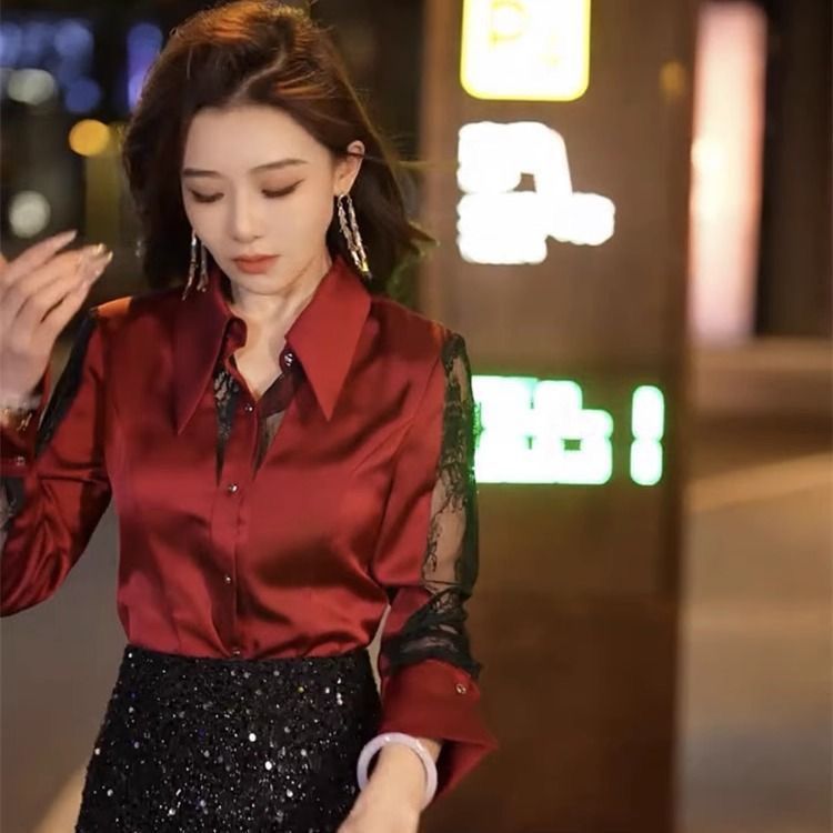 性感蕾丝拼接Polo领长袖 新款 衬衫 夏季 收腰显瘦百搭上衣 女法式 时尚