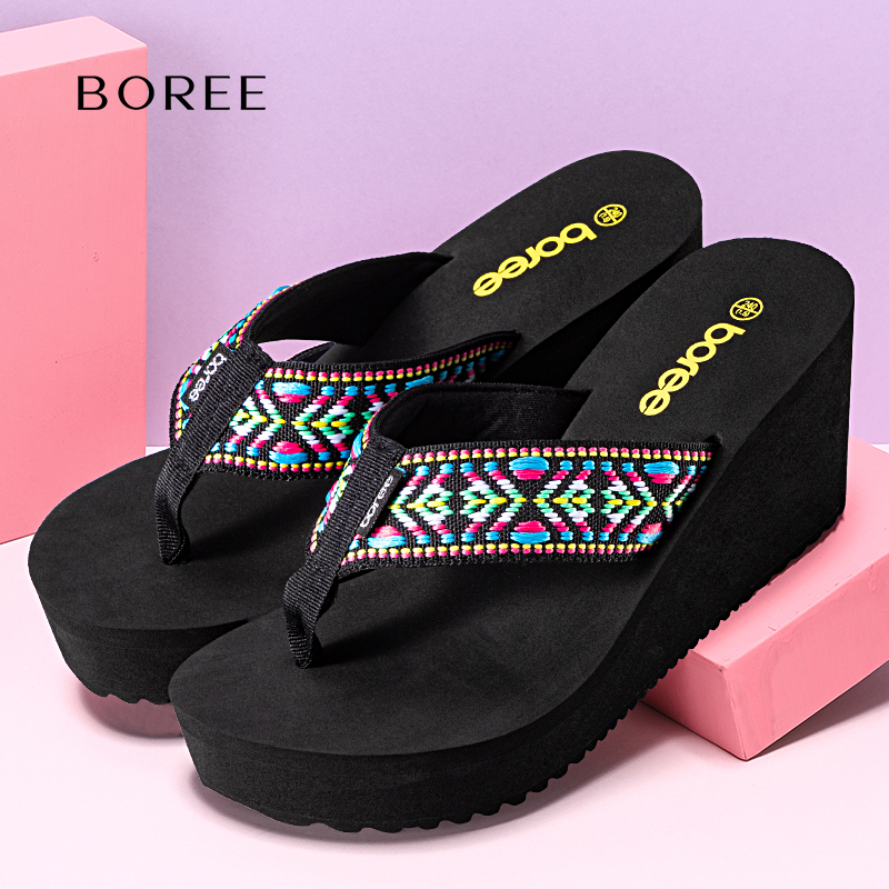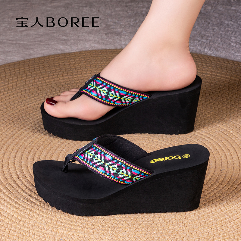 宝人厚底人字拖女夏外穿2025新款 黑色坡跟增高沙滩海边防滑凉拖鞋