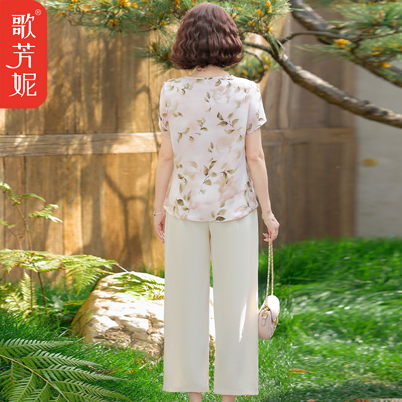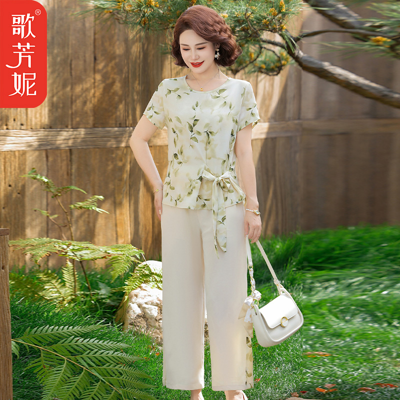 套装 2025新款 t恤上衣两件套女妈妈夏装 中老年人洋气短袖 雪纺小衫