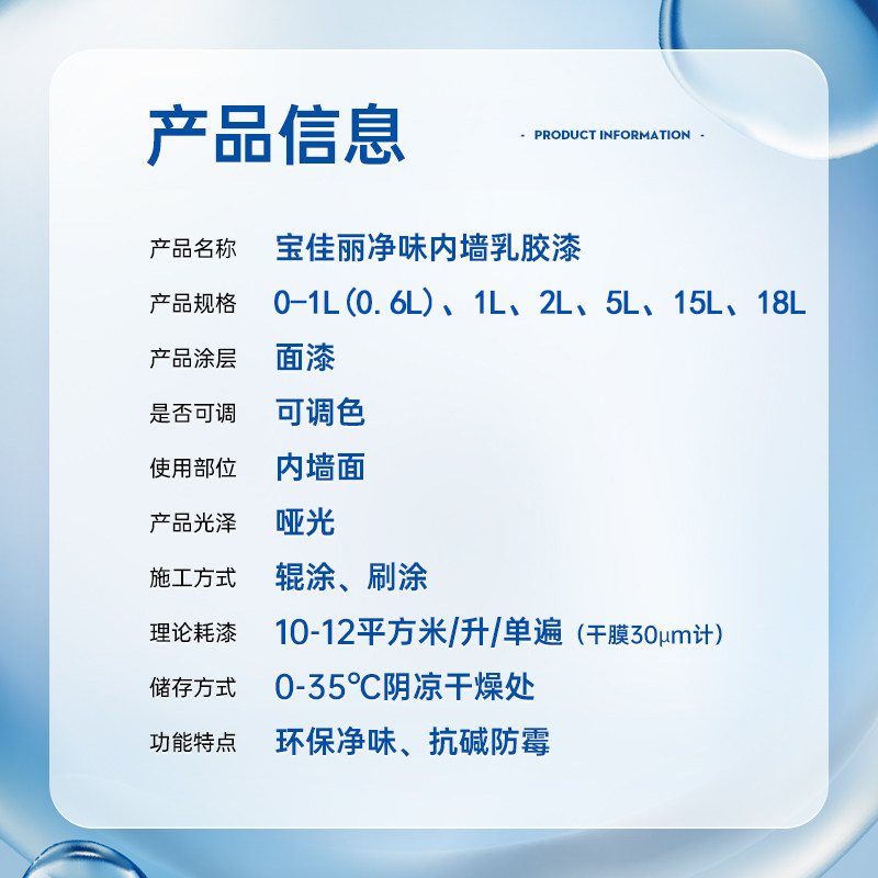 宝佳丽净味内墙白色乳胶漆室内家用环保墙面翻新自刷涂料墙漆面漆