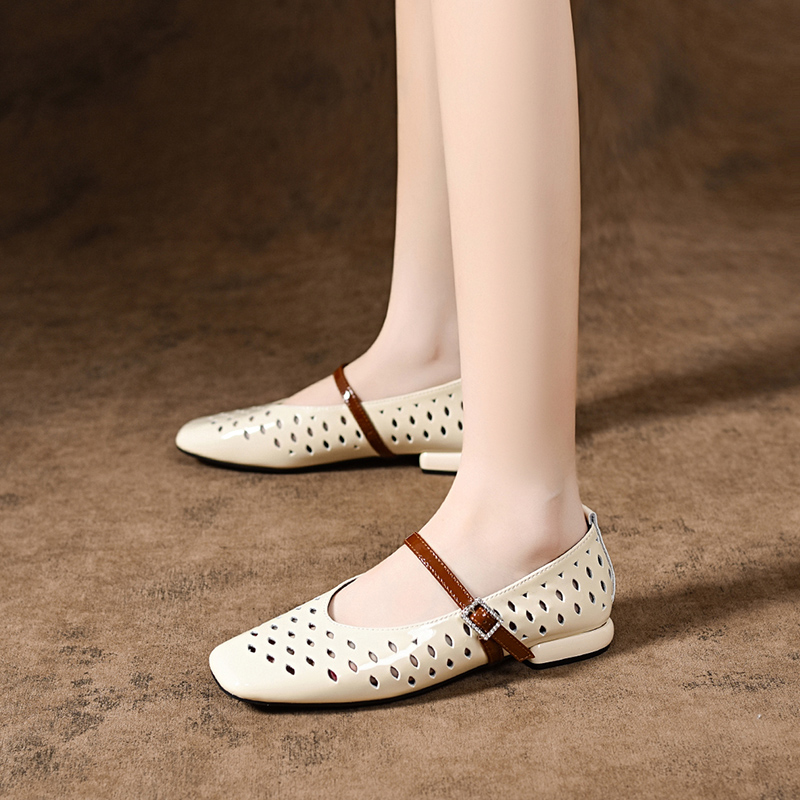 女士低跟真皮鞋 2025新款 夏季 软底平底镂空凉单鞋 方头软皮漆皮女鞋