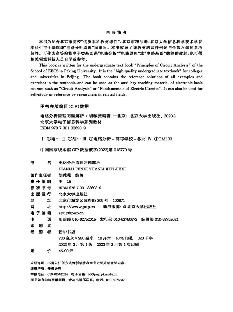 2023新书 北京大学出版 电路分析原理习题解析 北京大学电子信息科学系列教材 社9787301336939 胡薇薇 正版
