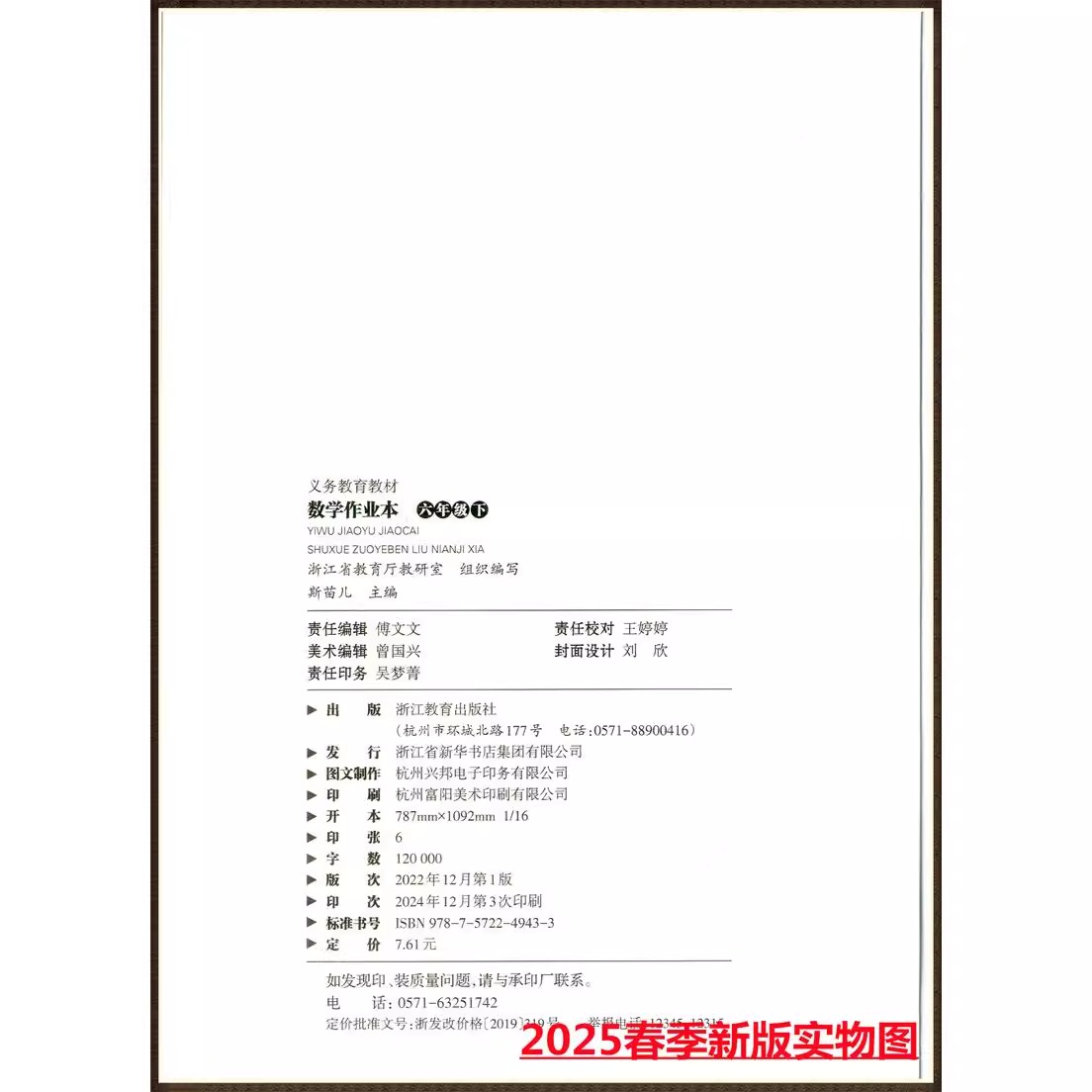 浙江教育出版 2025义务教育教材数学作业本六年级下人教版 每课一练数学课本6年级下课堂配套练习册课时同步训练 学校同款 现货