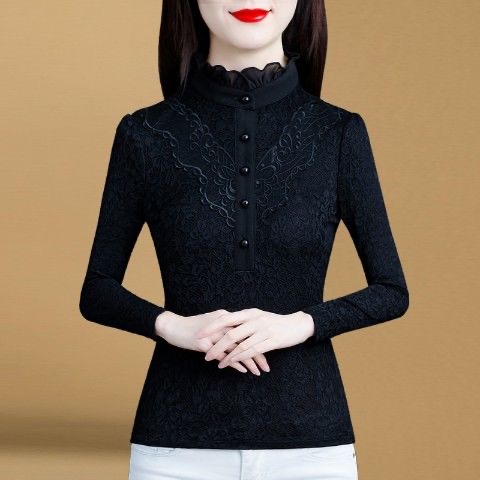大码 秋冬时尚 修身 2024新款 女装 女长袖 百搭小衫 加绒加厚蕾丝打底衫