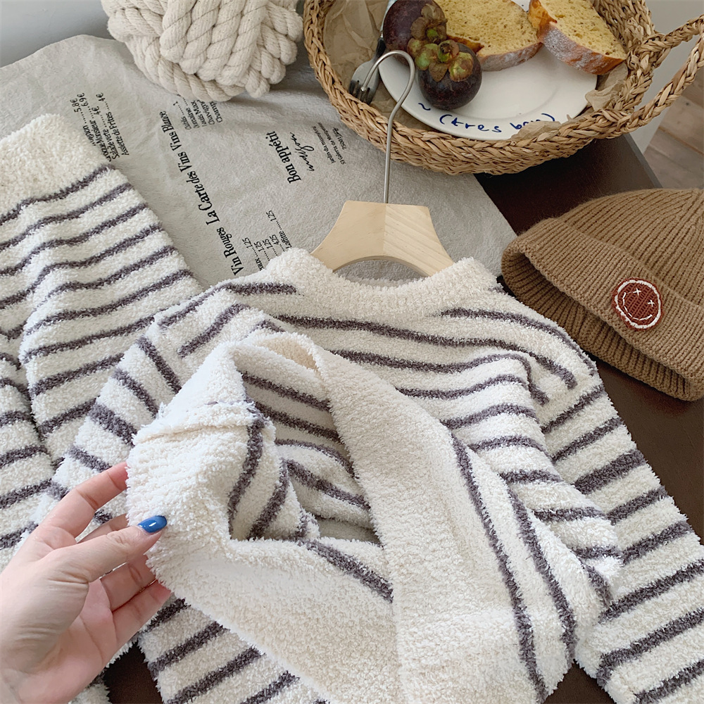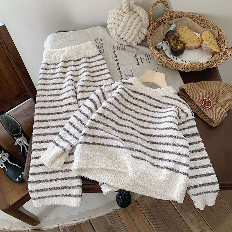 亲子韩国秋冬儿童宝宝条纹雪尼尔睡衣套装 男女童半边绒保暖家居服