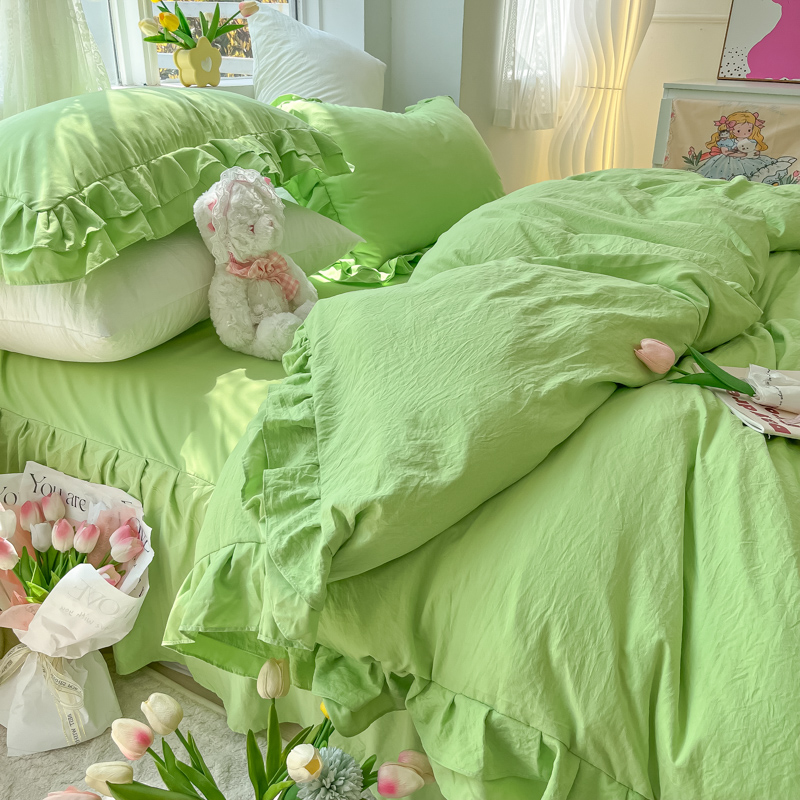 森系小清新绿色四件套床单被套纯色水洗棉床罩裙款 天床品 花边夏季