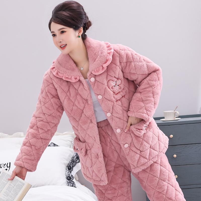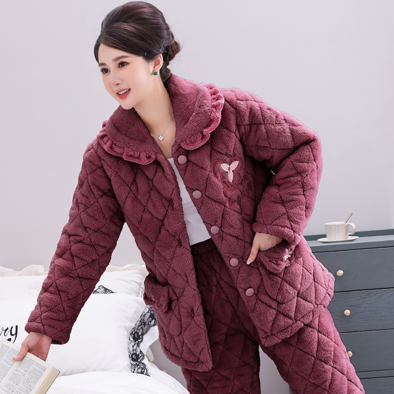 保暖家居服套装 睡衣女秋冬季 加厚加绒珊瑚绒夹棉中老年人妈妈新款