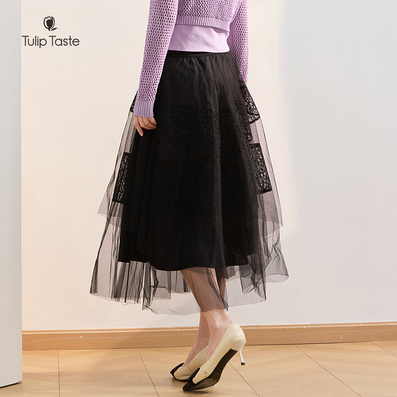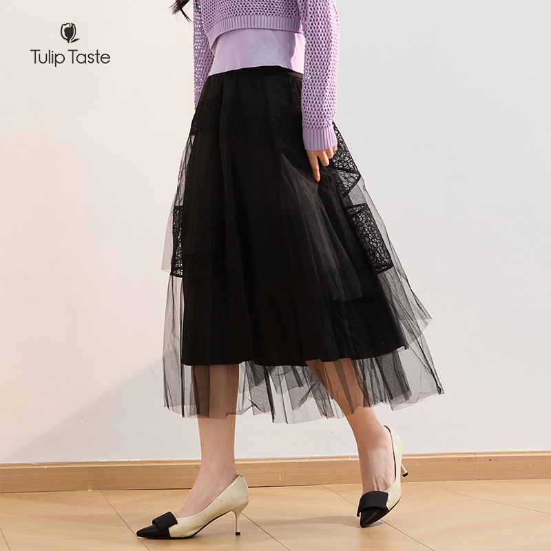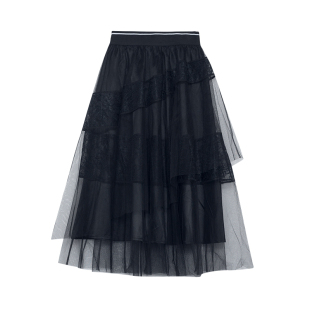森马半身裙女松紧腰A字裙气质夏季 拼接蕾丝波点长裙优雅 2025新款