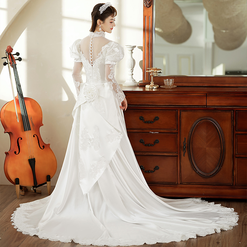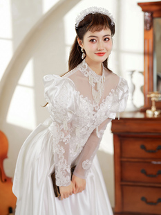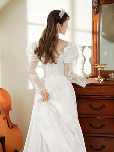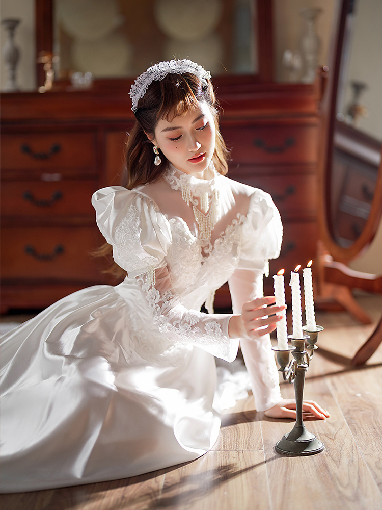 新款 轻奢公主港风写真礼服 80年代古董缎面婚纱影楼拍摄复古长袖