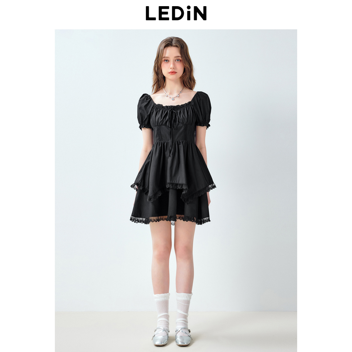 乐町收腰蛋糕连衣裙年夏季 蕾丝设计荷叶边小黑裙高腰公主裙 新款