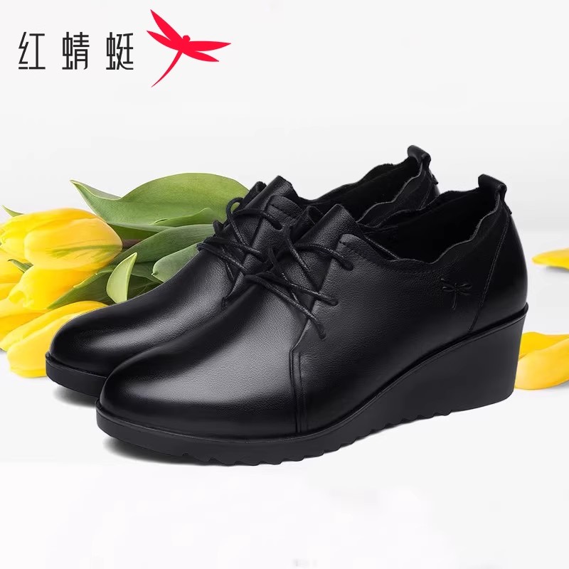 百搭软面皮深口单鞋 红蜻蜓女鞋 舒适坡跟休闲鞋 真皮中年妈妈鞋 秋季