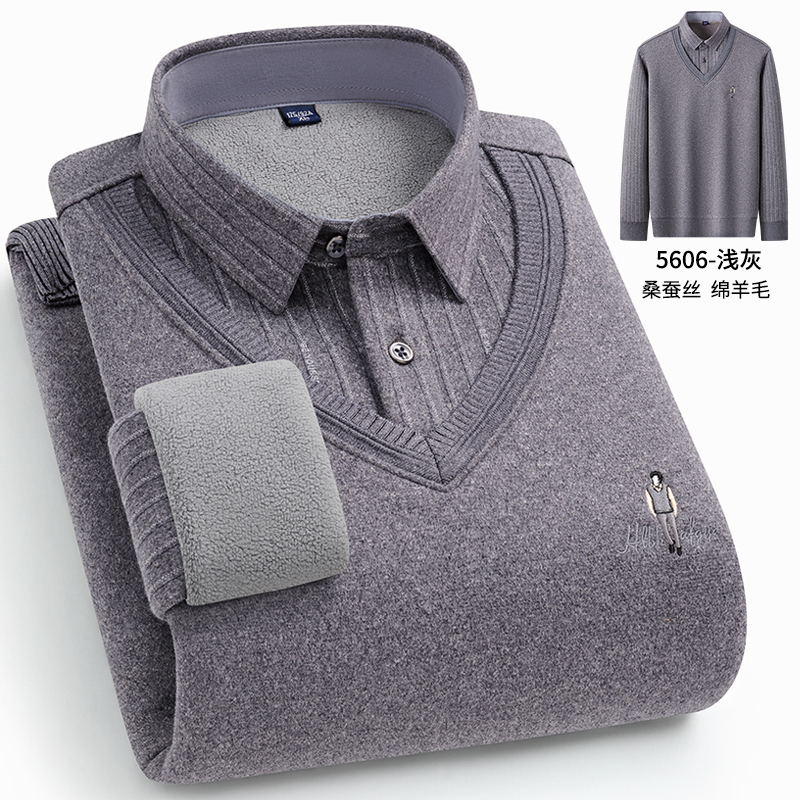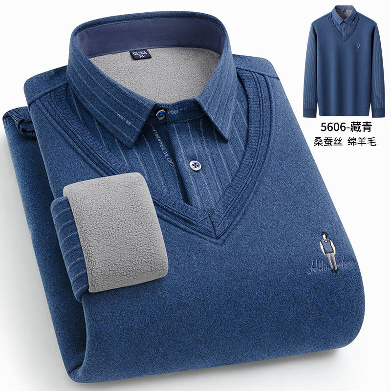 领针织打底衫 假两件保暖内衣毛衣加绒加厚衬衫 带领上衣服 男士 冬季