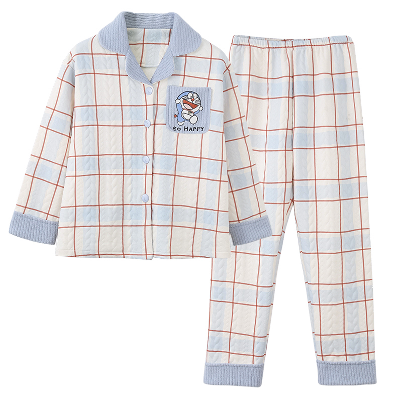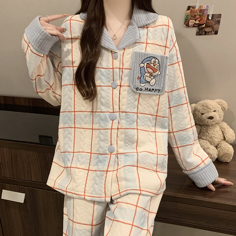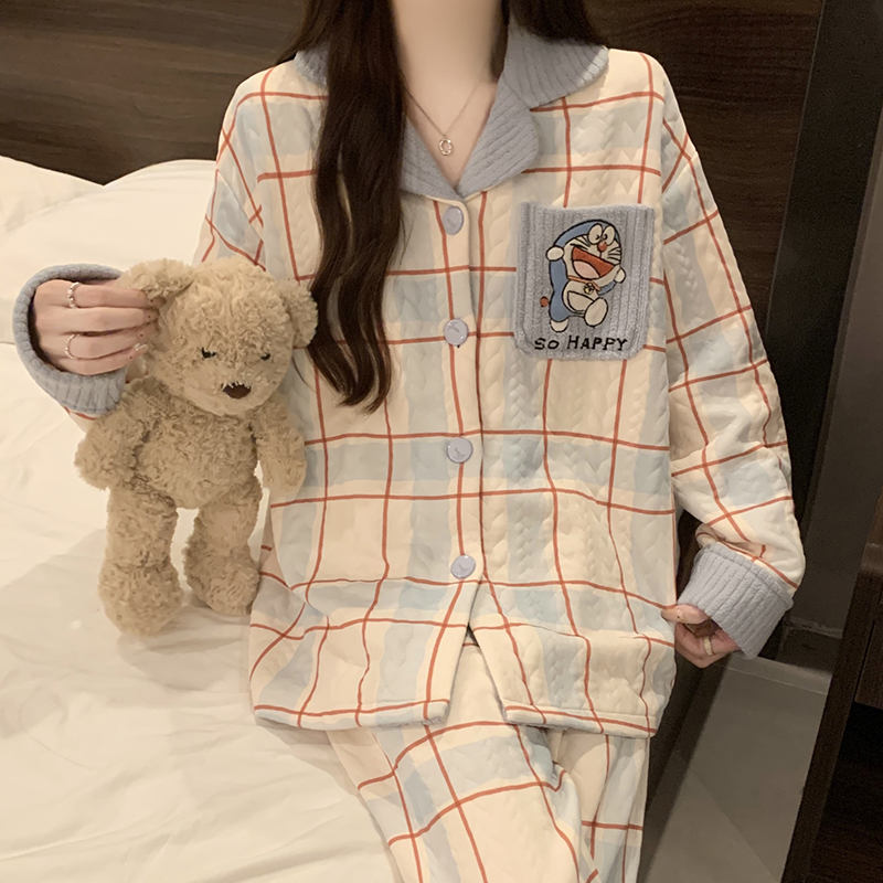 可外穿 家居服空气棉夹层加厚套装 卡通格子睡衣女款 秋冬天保暖长袖