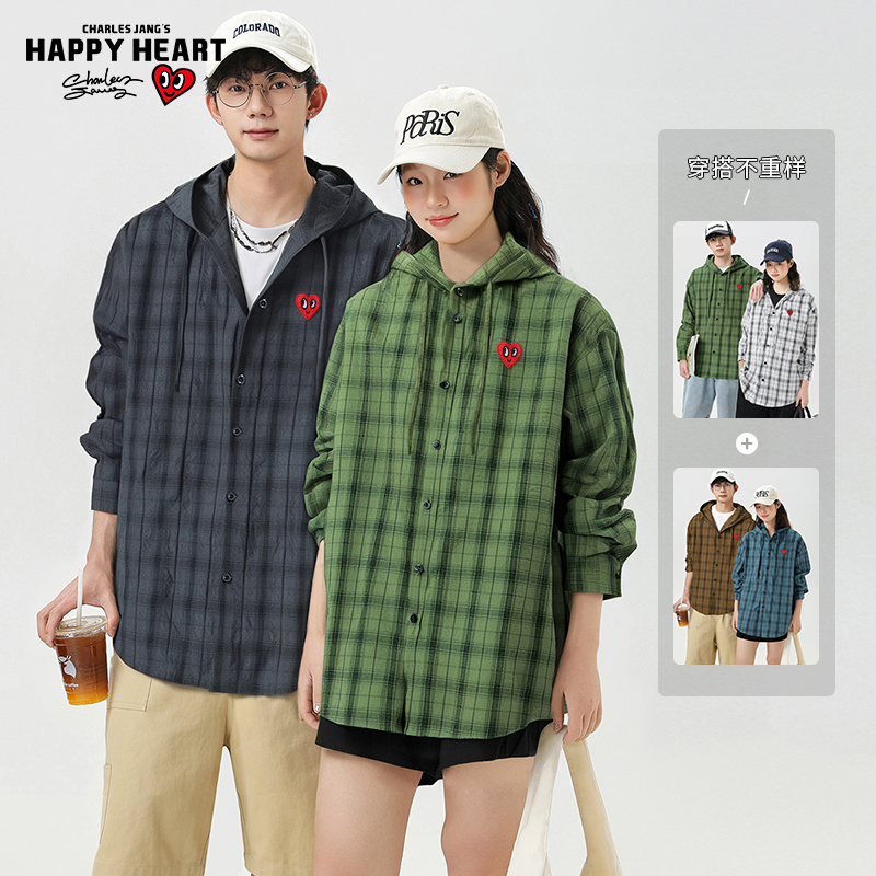 百搭美式 查尔斯桃心 男女春秋季 衬衫 情侣外套 格子复古连帽长袖