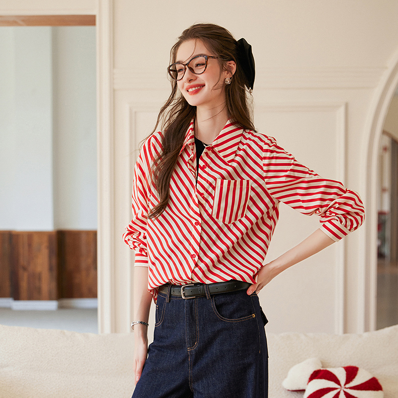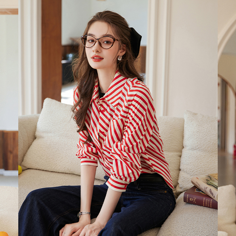 衬衫 女式 复古翻领质感百搭长袖 白鹿语港风间色条纹衬衣25秋款