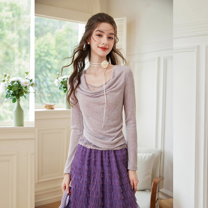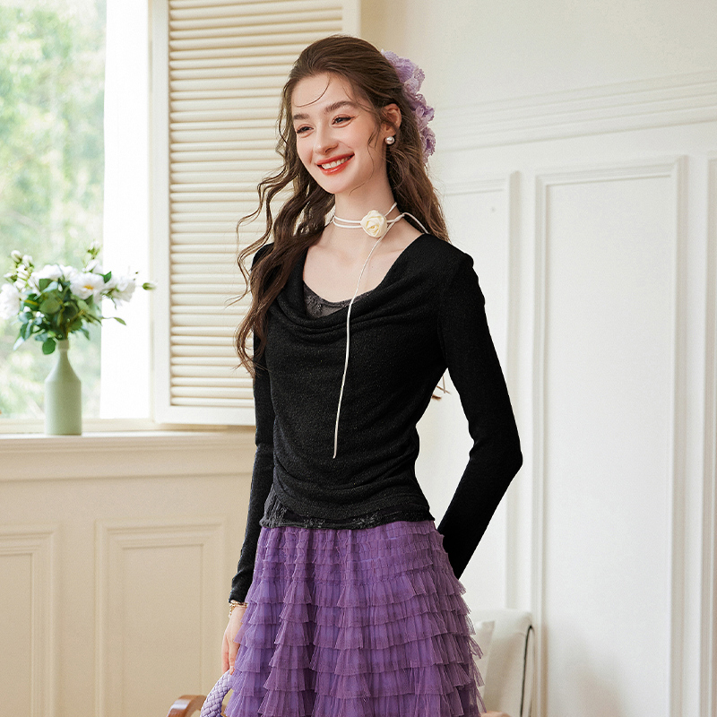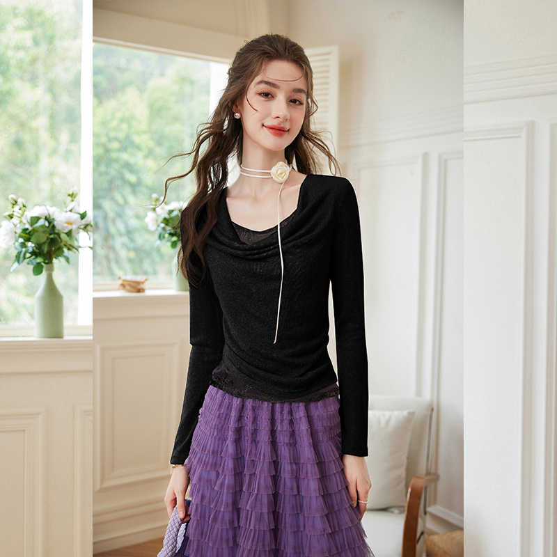 上衣 显瘦长袖 白鹿语假两件荡领蕾丝拼接T恤25秋新款 温柔气质修身