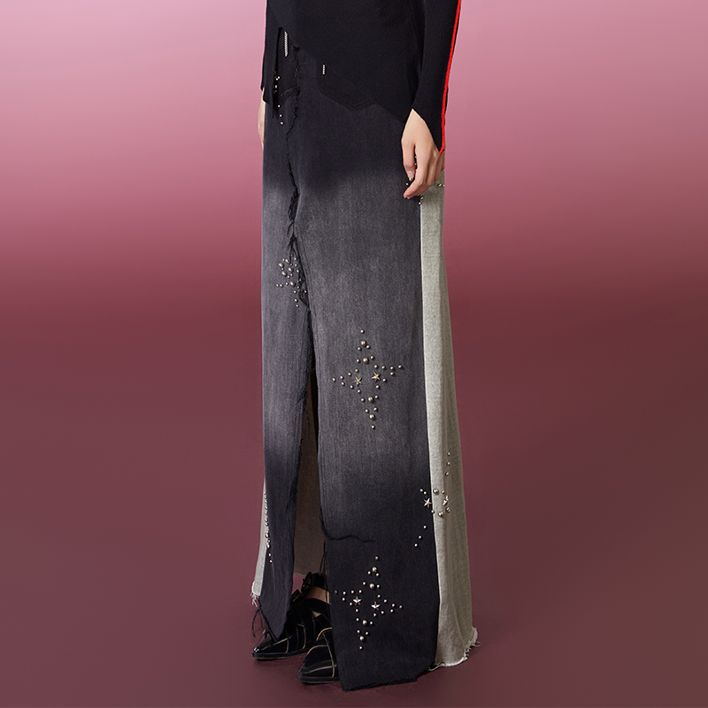密扇游龙戏凤秋冬新款 拼接牛仔长裙深灰浅灰色斜角线拼接