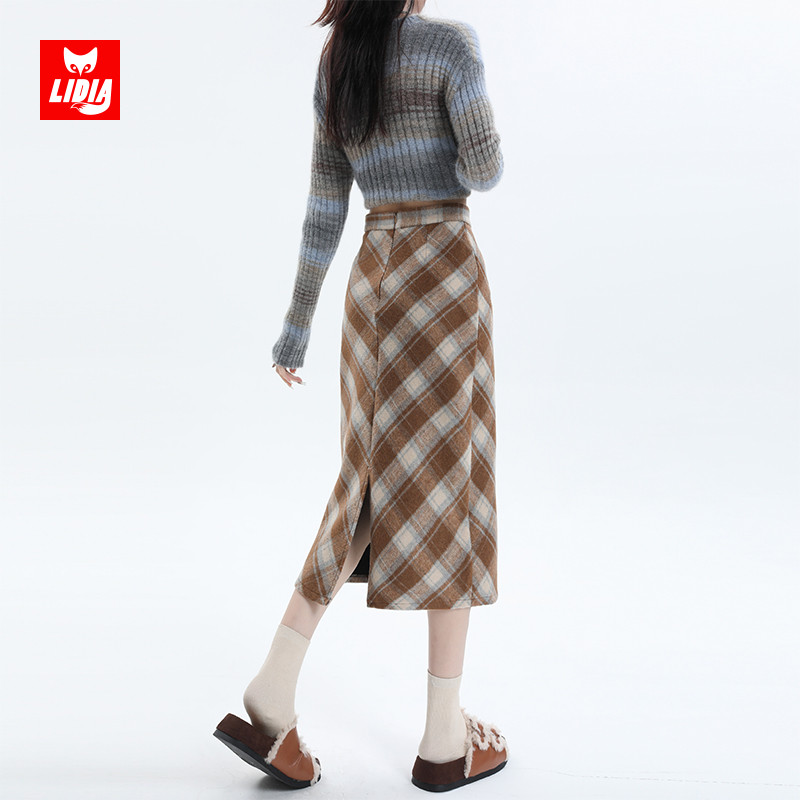 卡其毛呢格子半身裙女秋冬2025新款 a字裙 高腰显瘦梨形身材中长款