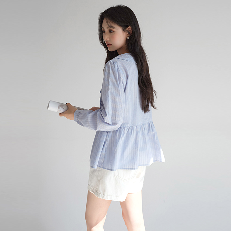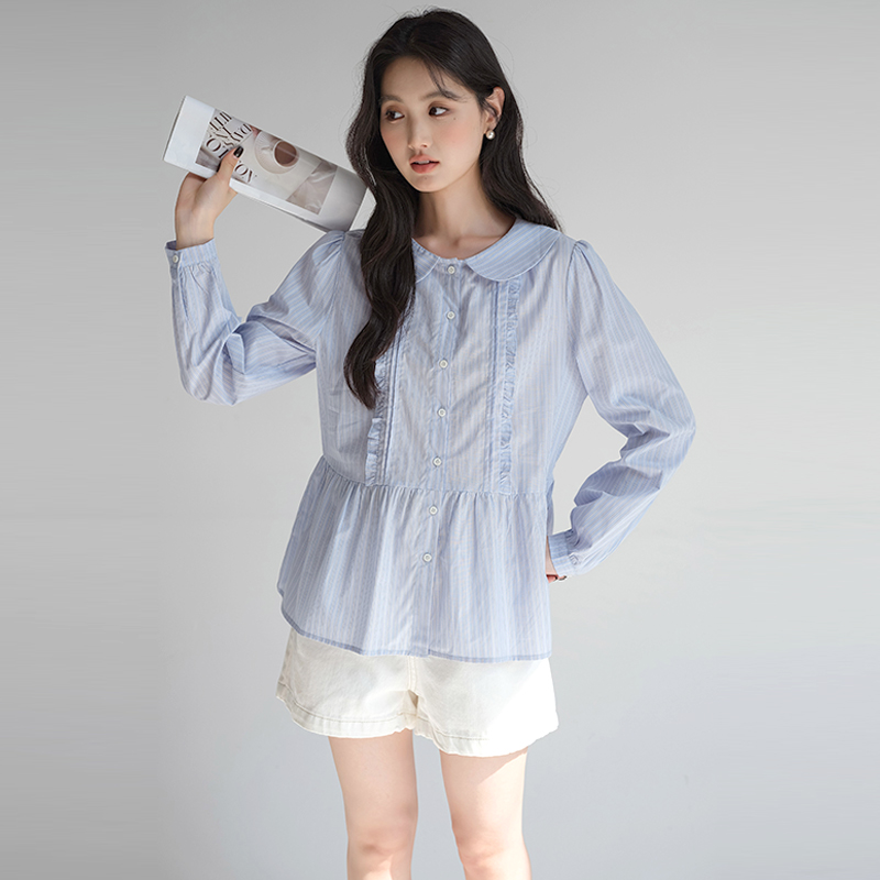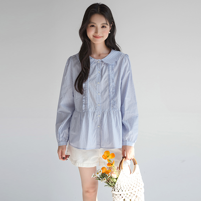女装 胖mm甜美减龄法式 2025秋季 条纹娃娃领衬衫 上衣 新款 蓝若水大码