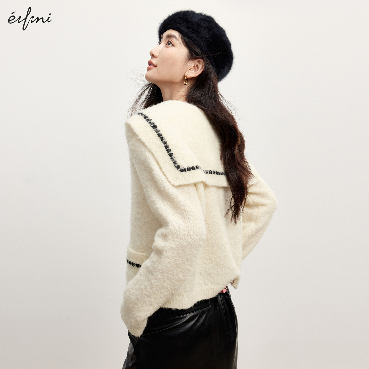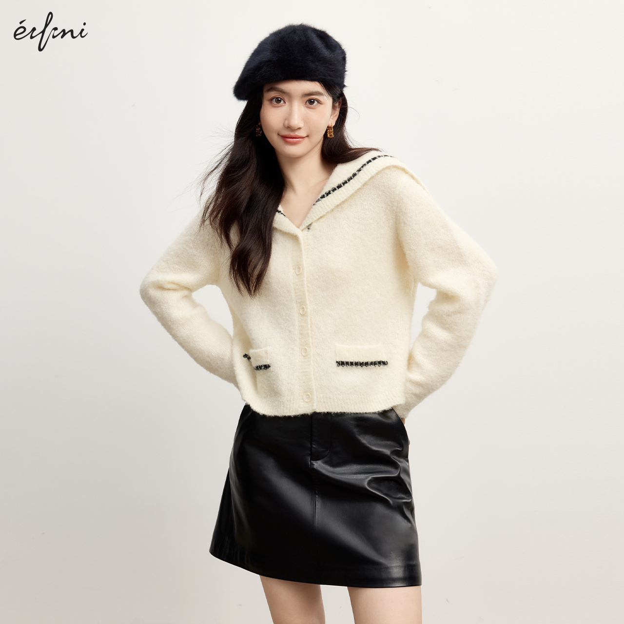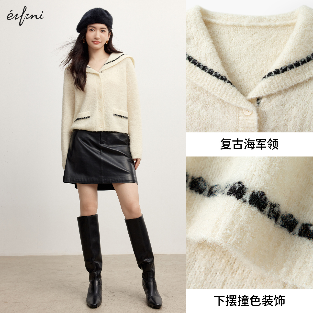 伊芙丽outlets店米色复古海军领圈圈纱针织开衫 春秋毛衣外套女
