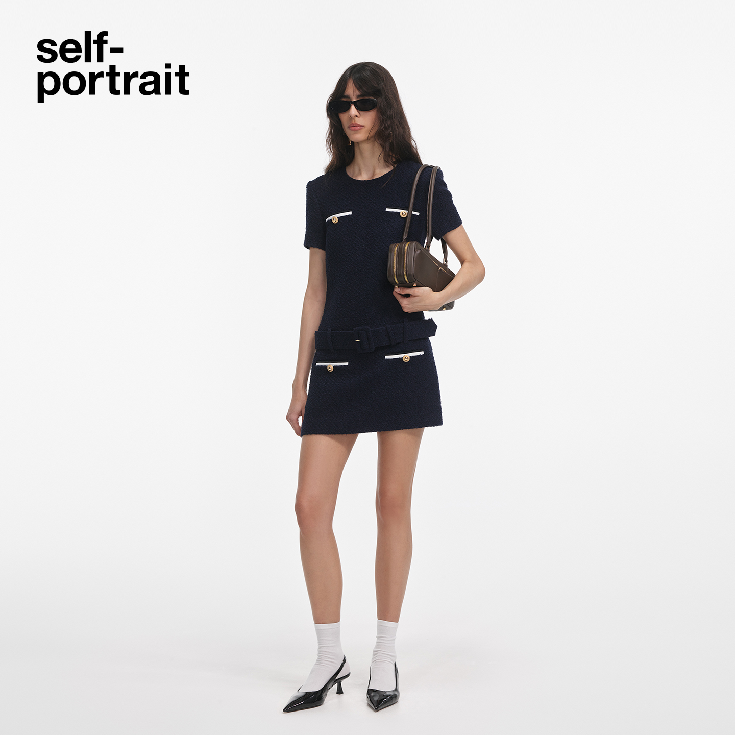 收腰显瘦连衣裙短裙春 新款 阔色针织长袖 拼接花苞小黑裙女2025秋季
