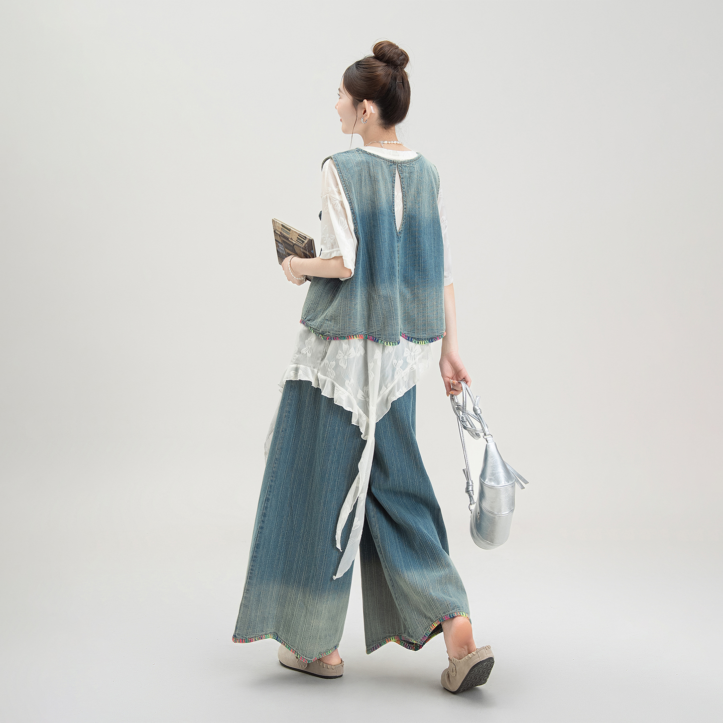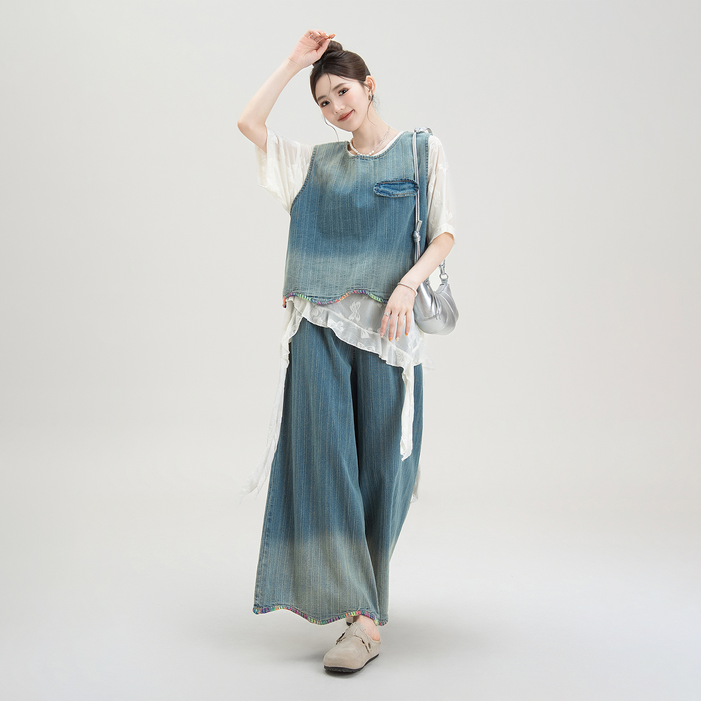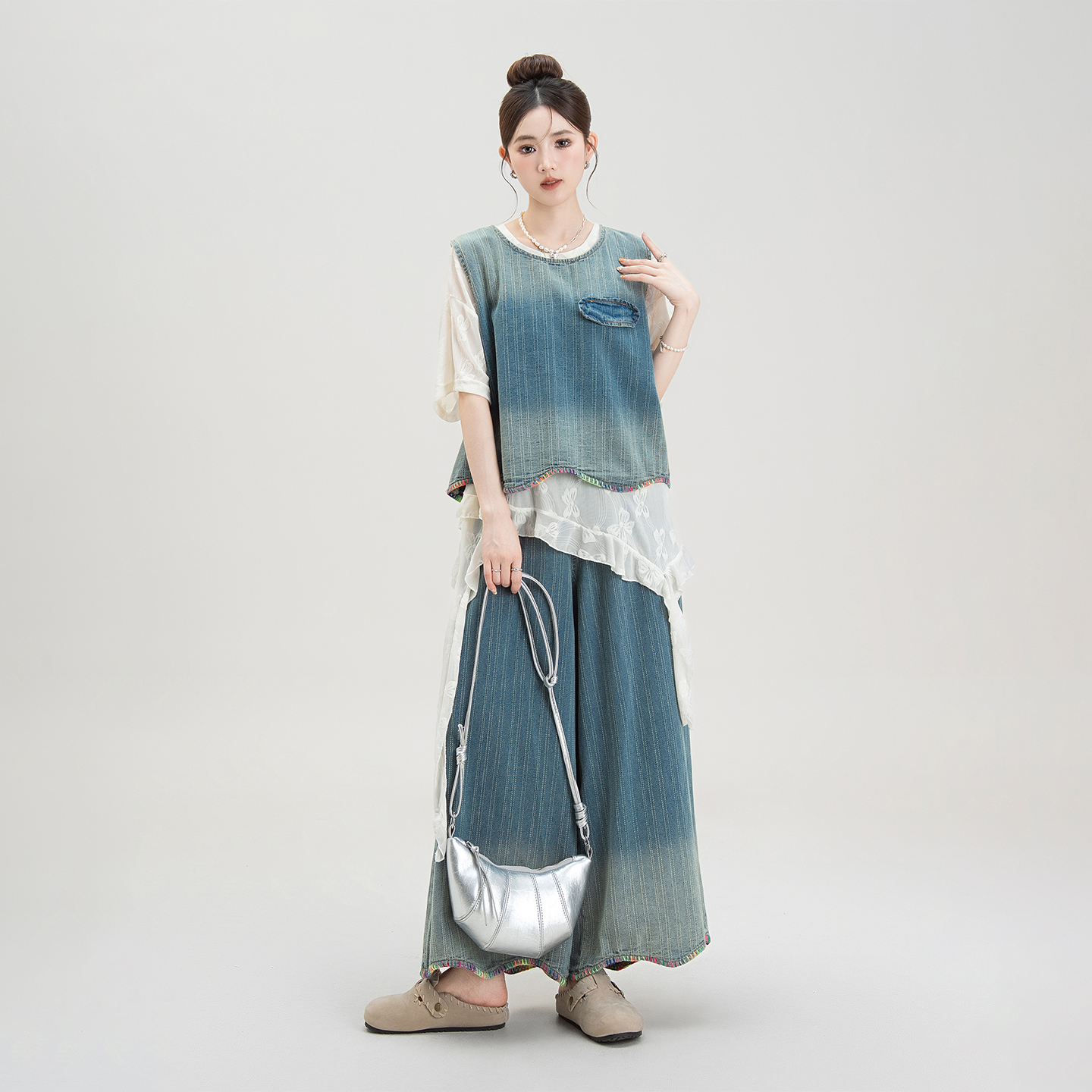 套装 叠穿渐变牛仔马甲花边阔腿裤 新款 杏色不规则荷叶边上衣女夏季