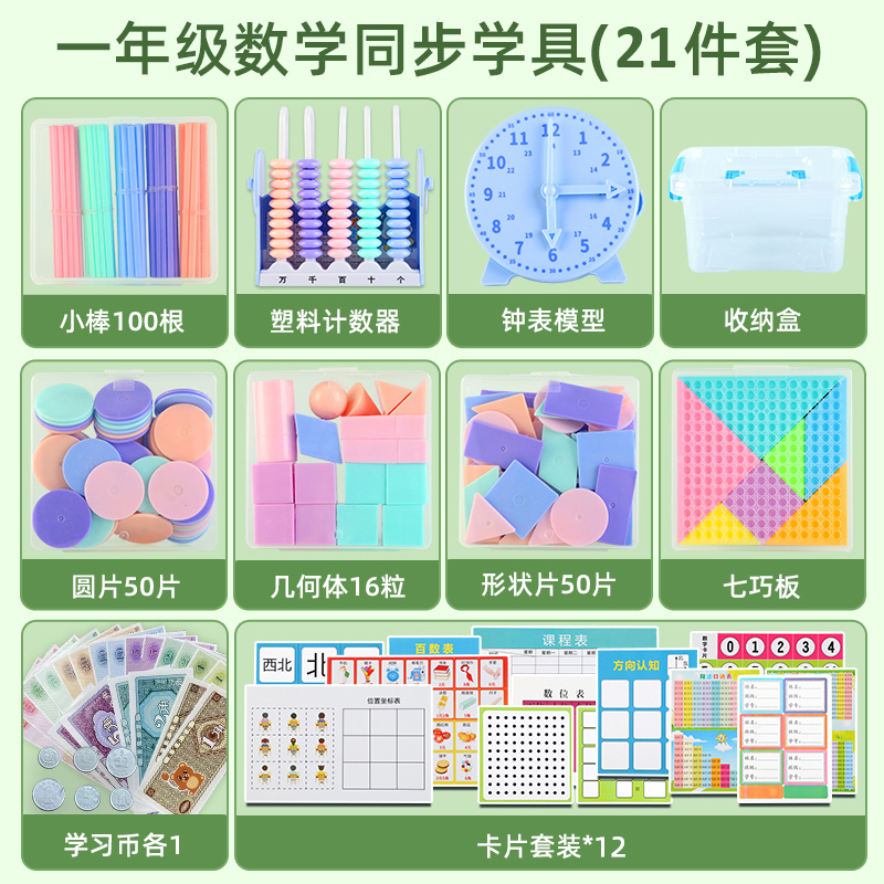一年级数学学具盒教具套装 上册小学生计数器钟表计数棒几何体苏教