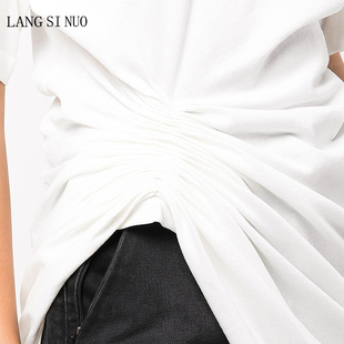褶皱不规则下摆纯棉纯色上衣女 圆领宽松中长款 2023新款 欧美夏短袖