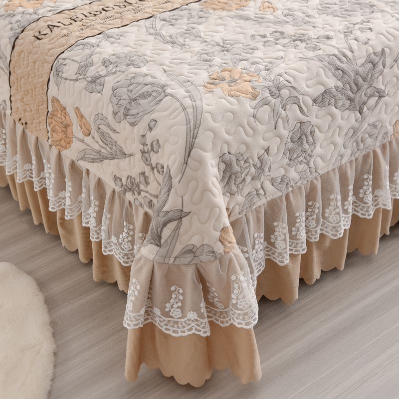 秋冬天加绒牛奶绒床盖单件冬季 加厚蕾丝花边珊瑚绒夹棉床裙三件套
