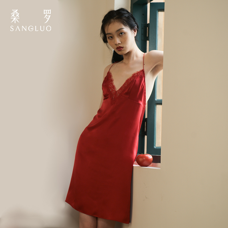 新娘晨袍 桑罗红色性感真丝吊带晨袍2件套100%桑蚕丝女可外穿